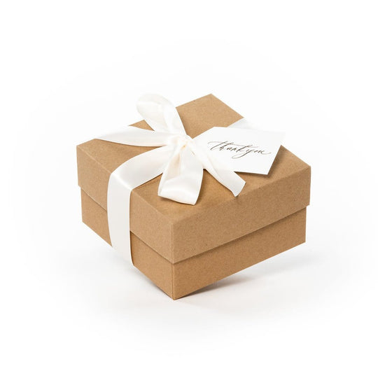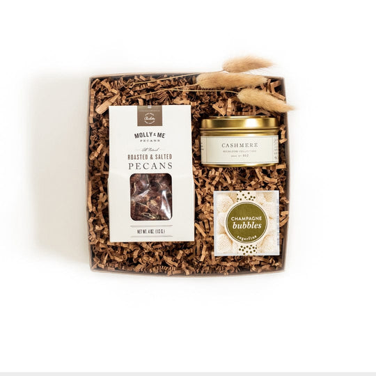 GIFT CONTENTS: Small Kraft Box with Lid; Champagne Bubbles Gummy Candy; Hand-Poured Soy Candle in Cashmere Scent; Roasted & Salted Pecans; Kraft Basket Fill; Letterpressed Calligraphy Gift Tag; Double-Sided Satin Ribbon in Ivory; Natural Bunny Tails for a Finishing Touch!